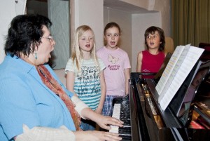 Nach der Chorprobe gibt es für die Solisten noch Einzelunterricht. Neben Oskar und Laura singt auch die neunjährige Fiona ein Solo. Sie ist die Meereshexe. Die Chorleiterin begleitet die drei Sänger am Klavier. Zuerst üben sie die hohen, dann die tiefen Töne. "Legt eure Hände an den Bauch, dann spürt ihr beim Singen euer Zwerchfell. Und stellt euch bequem hin, damit der Ton den Weg von der großen Zehe bis zum Kopf findet."