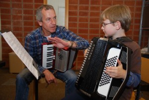 Akkordeon-Lehrer Roland Wankmüller hat den Notenständer aufgebaut und sich neben Benedikt auf einen Stuhl gesetzt. "Zuerst das Stück vom Kuckuck", fordert er seinen Schüler auf. Voller Konzentration legt Benedikt die Finger auf Tastatur und Knopfleiste und beginnt zu spielen. Langsam zieht er dabei den Blasebalg auseinander, wodurch das Instrument immer größer wird. Der Lehrer schaut zufrieden. Nur einmal greift er ein, weil Benedikt aus dem Takt gekommen ist. Mit Klatschen üben sie gemeinsam, welcher Takt der richtige ist.